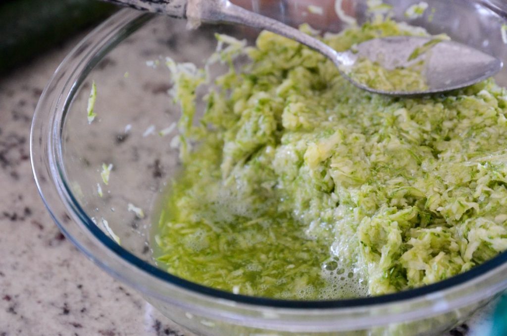 - Misture a abobrinha ralada com 1 colher (de chá) de sal, em 10 minutos você perceberá ela murchar e sair uma boa quantidade de líquido, esprema com as mãos a abobrinha para retirar todo o excesso de umidade,