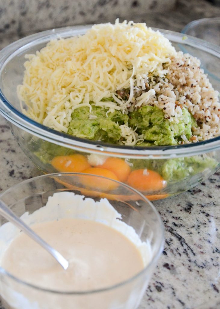 - Adicione o arroz cozido, 2 xícaras do queijo, a cebolinha, os temperos e o restante do sal,
