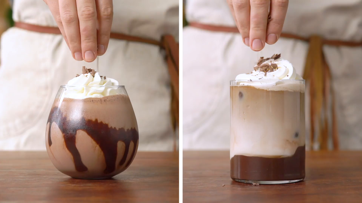 - Colocar a calda de chocolate na borda do copo, colocar o café gelado e finalizar com o chantilly e com as raspas de chocolate.