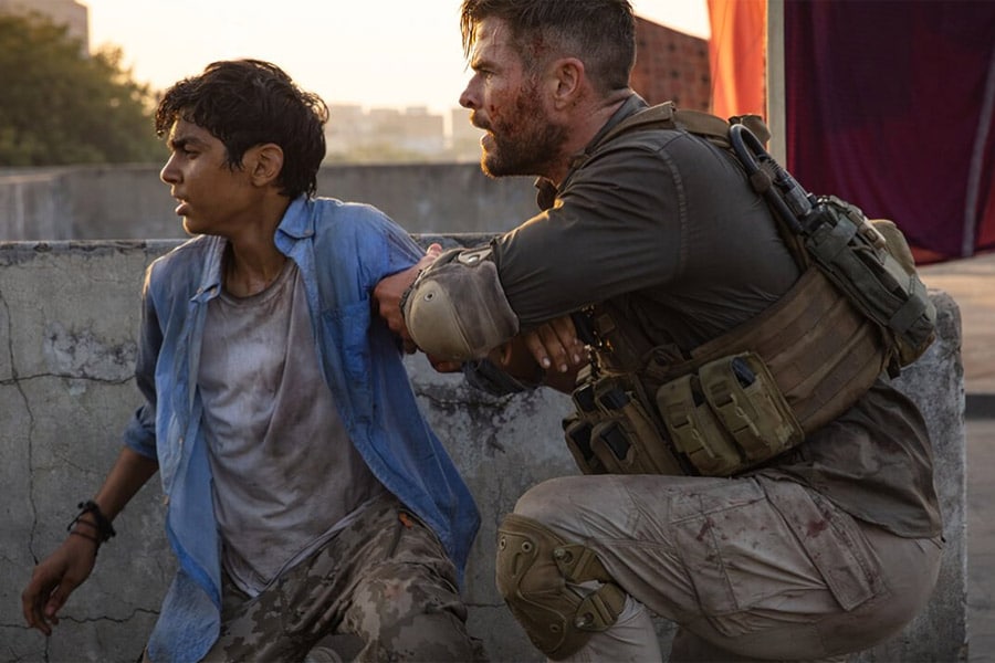 Em Resgate, o lindo Chris Hemsworth interpreta Tyler Rake, um mercenário fã de galinhas, whiskey e remédios controlados.