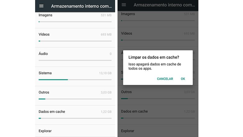 Se você já seguiu o passo anterior e desinstalou alguns apps, pode já ter aberto algum espaço. Se não tirou nada, talvez seja a hora de limpar aquela pasta de imagens do WhatsApp, suas fotos e vídeos pessoais e até o cache do aparelho (para isso, vá nas “Configurações”, depois em “Armazenamento”, seguindo até “Dados em Cache”. Clique em cima dele e confirme a mensagem para limpar esse cache).
