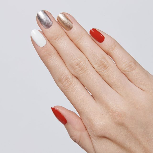 Por outro lado, que tal entrar na moda “uma unha de cada cor” e ousar no look mais colorido para a ceia? Aqui, mantendo o clima natalino, a dica também é usar cores que remetam ao Natal – e vale a dica extra de fazer “irmãs gêmeas” (ou seja, deixar duas unhas com o mesmo tom) para criar um ar elegante e com menos contraste nos dedos.