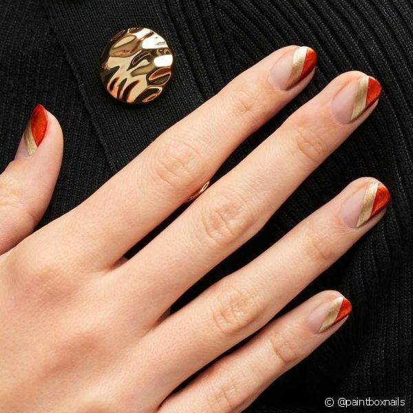 1. Nail art de francesinha transversal com esmalte vermelho e dourado