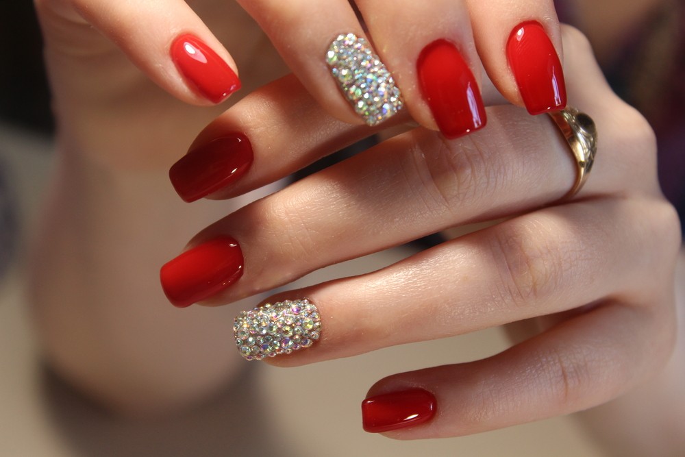 1. Esmalte vermelho com aplicação de joia ou strass
