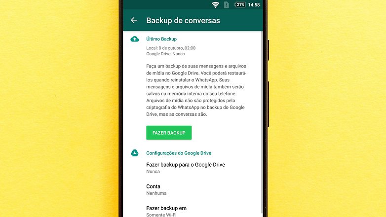 Em seguida, no WhatsApp, vá em Configurações > Conversas > Backup de Conversas. Lembre-se de estar marcado para usar apenas o Wi-Fi, além de ter bateria suficiente no aparelho, já que pode demorar um pouco. Você também pode marcar para que os vídeos baixados pelo WhatsApp façam parte do backup. Clique em Fazer Backup. Agora é só esperar o upload dos arquivos para a nuvem.