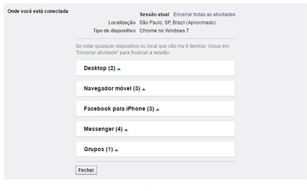 Sabe quando você volta da casa da sua amiga e fica se perguntando “puts, será que eu sai do meu Face?”, então, para tirar essa dúvida é só entrar nas configurações do seu Facebook, clicar em “segurança” e depois em “onde você está conectada”. O melhor de tudo é que, se você estiver logada em alguma lugar que você não queira, basta clicar em “encerrar atividade” para finalizar isso.