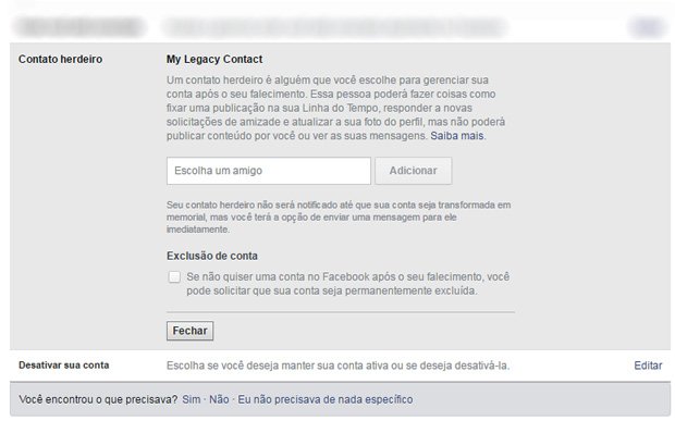 Você nunca se perguntou o que aconteceria com o seu Facebook quando você morrer? Meio trágico, né? Mas o aplicativo te dá a opção de selecionar uma pessoa que será responsável pela sua conta caso isso ocorra. Também na aba de segurança, você pode selecionar um pessoa na opção “contato herdeiro”