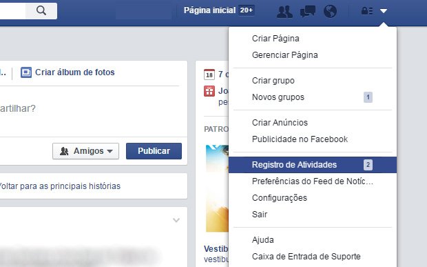 Quer saber o que você curtiu há dois anos atrás? Ou o que você comentou na foto da sua amiga há um tempão? Basta clicar em “registro de atividades”, lá no canto superior direito.