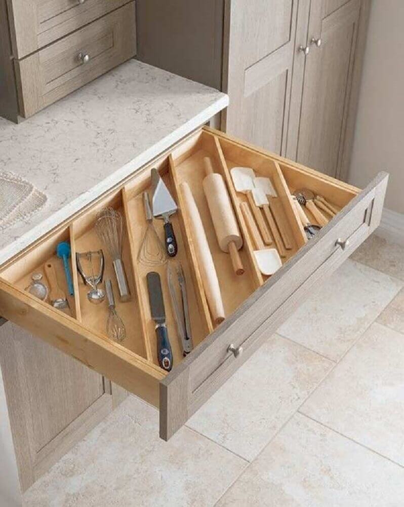 Os modelos mais modernos de armários de cozinha podem vir com gavetas e compartimentos específicos para armazenar determinados itens.