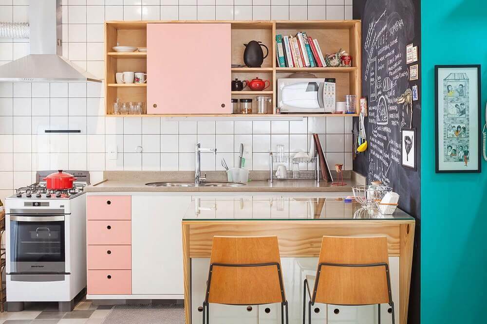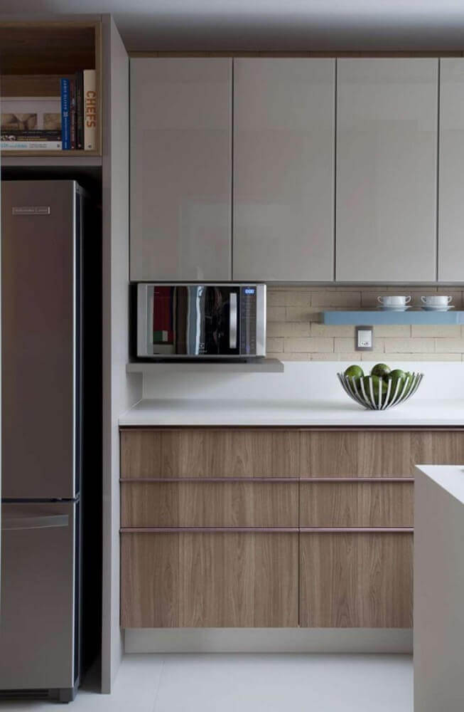 Uma boa forma de fazer o armário de cozinha pequeno é investindo em projetos de armários de cozinha modulado ou planejado, pois, como a cozinha é pequena, é interessante poder explorar todos os cantinhos do ambiente. Desta forma, os armários de cozinha atendem sua necessidade cotidiana e facilita na hora de organizar a cozinha.