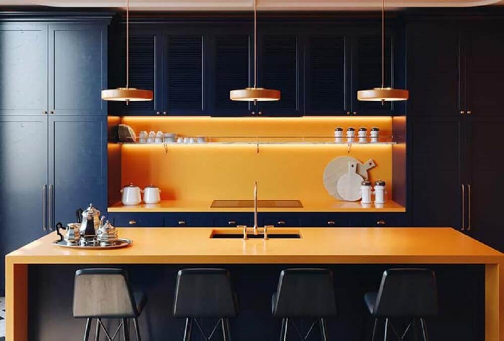 O interessante do armário de cozinha planejado é poder brincar com detalhes e cores, você pode por exemplo planejar que o seu armário de cozinha de parede possua determinadas cores nas portas e o armário de cozinha planejado que fica na parte de baixo tenha outra cor, assim como na cozinha decorada abaixo, onde o armário de cozinha de parede recebeu portas na cor laranja e os demais armário de cozinha planejado foram feitos em tons neutros de madeira.