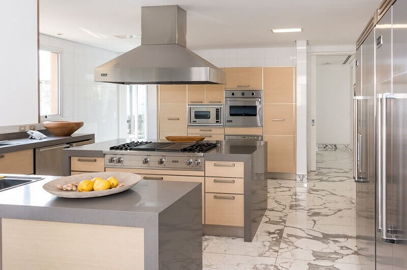 Para um toque moderno na sua cozinha, opte por modelos de armários de cozinha com linhas mais simples e retas, sem muitos detalhes ou mesmo em um modelo de armário de cozinha com acabamento em aço inox.