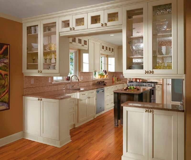 Já para um estilo mais retrô ou uma decoração com estilo provençal, opte por modelos de armários de cozinha com puxadores clássicos e com detalhes nas portas dos armários de cozinha.