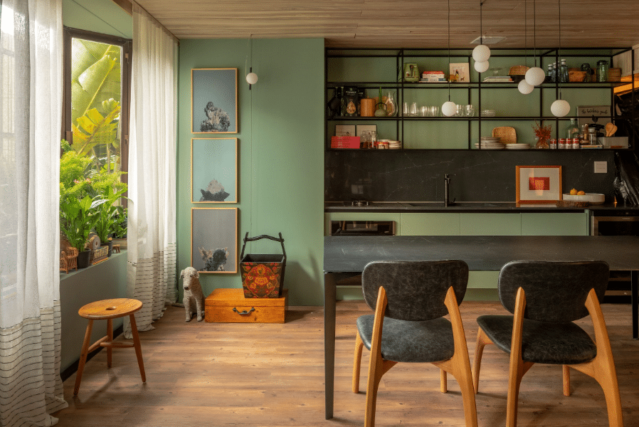 Em 2025, a tendência não é só a cor, mas a combinação de cor + textura: parede com acabamento em cimento queimado, madeira crua, pintura com efeitos como veludo fosco ou microcimento ganham força para reforçar a sensação visual e tátil do ambiente.