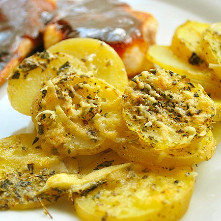 Disponha as batatas num refratário, tempere com sal e pimenta do reino a gosto e regue com o leite de amêndoas. Salpique orégano por cima e cubra com o queijo parmesão ralado