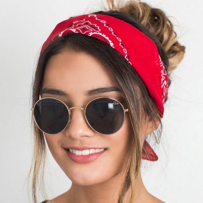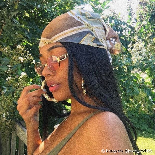 Se a ideia é deixar o cabelo solto mas, ainda assim, dar um toque a mais nos fios, vale apostar no lenço como tiara! Você pode deixar as pontinhas do lenço soltas, junto com o cabelo, ou criar um laço ou nó no topo da cabeça.