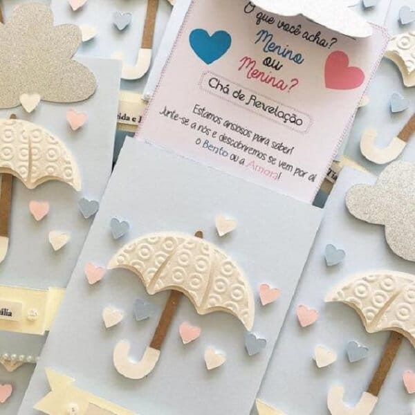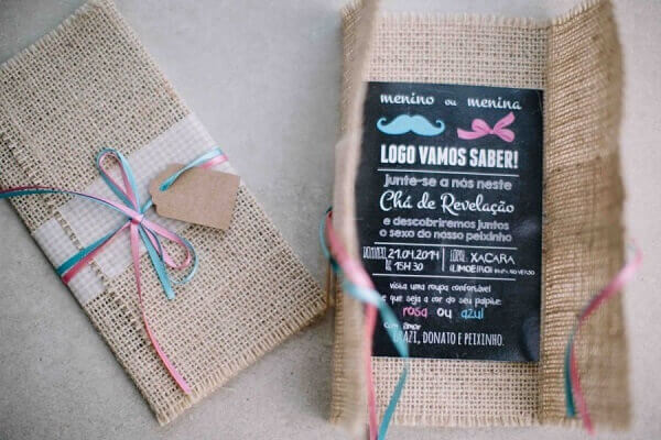 Evite colocar no convite chá revelação motivos femininos ou masculinos e sempre escolha por temas e cores neutras. Para elaborar o convite chá revelação é possível utilizar vários materiais como papel cartão, juta, tecido ou até mesmo fazer convites digitais.