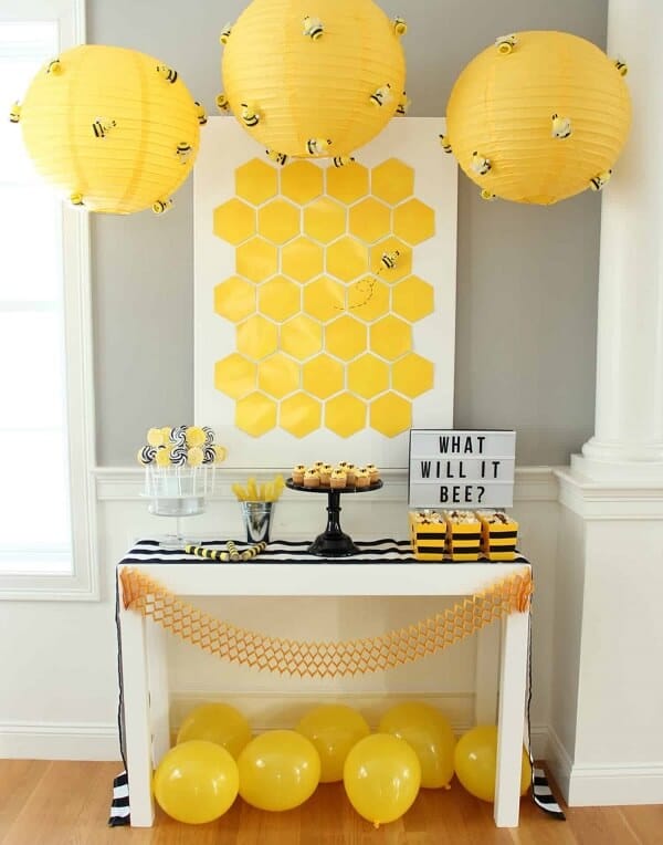 Na imagem acima, o tema da decoração chá revelação foi à colmeia em tom amarelo. A neutralidade evita que os convidados percebam antecipadamente o sexo da criança.