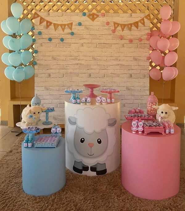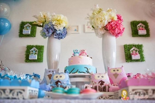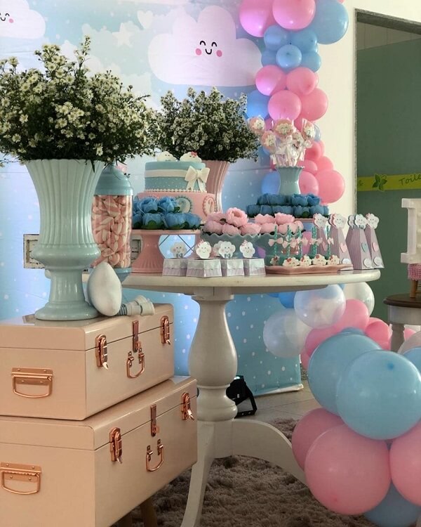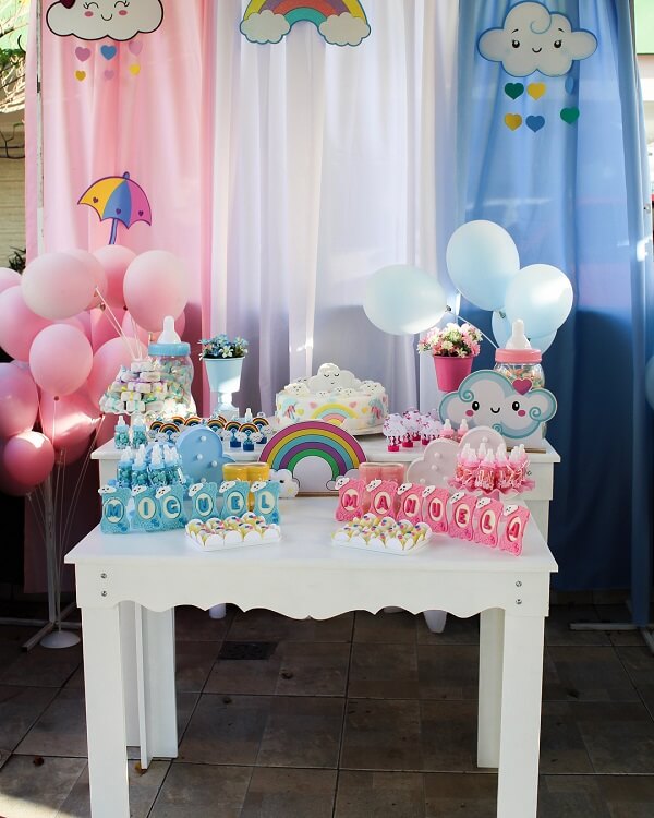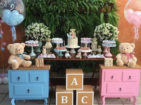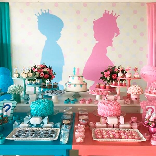 Os elementos decorativos da mesa chá revelação são elaborados com temas infantis que agregam os dois sexos como carrinhos, bonecas, chupetas e sapatinhos.
