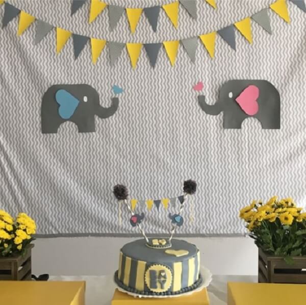 Na imagem acima, o tema da decoração chá revelação foi à colmeia em tom amarelo. A neutralidade evita que os convidados percebam antecipadamente o sexo da criança.