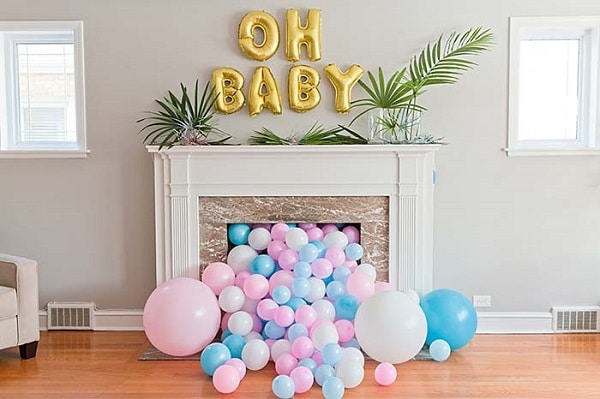 As cores da decoração chá revelação geralmente utiliza o rosa e o azul simultaneamente, mas para que nenhum convidado perceba o sexo da criança antes do anúncio é necessário equilibrar a mesma quantidade de objetos, doces e balões das duas cores.