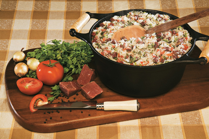 - º – Coloque sobre o papel alumínio 500 g de picanha (ou maminha ou contra-filé) temperada com sal grosso, volte a panela ao fogo BAIXO, feche e conte 20 minutos após pegar pressão.