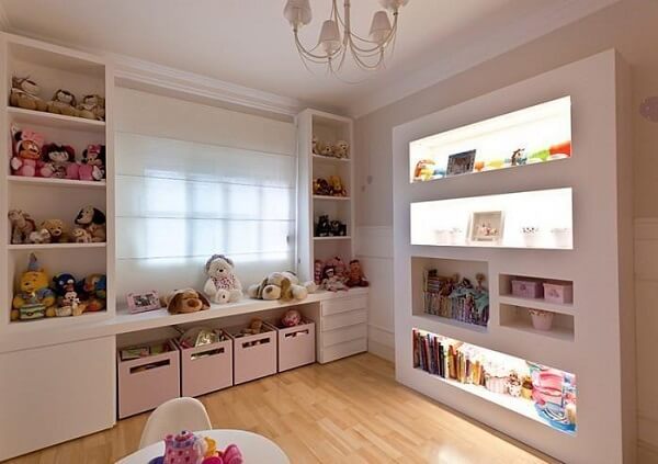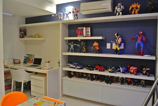 Saiba que o processo de organização de um ambiente auxilia no crescimento de responsabilidade e independência da criança. Logo, nesse ambiente, a fim de contribuir com a organização do espaço foi posicionada uma estante para quarto infantil embutida na parede, onde inúmeros bonecos colecionáveis foram expostos de forma decorativa.