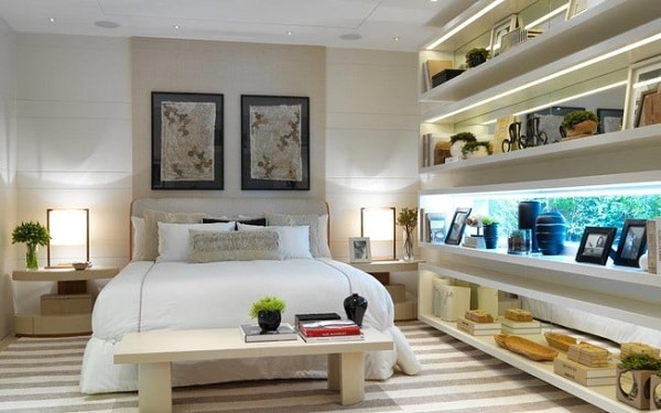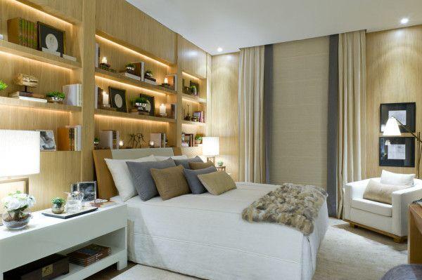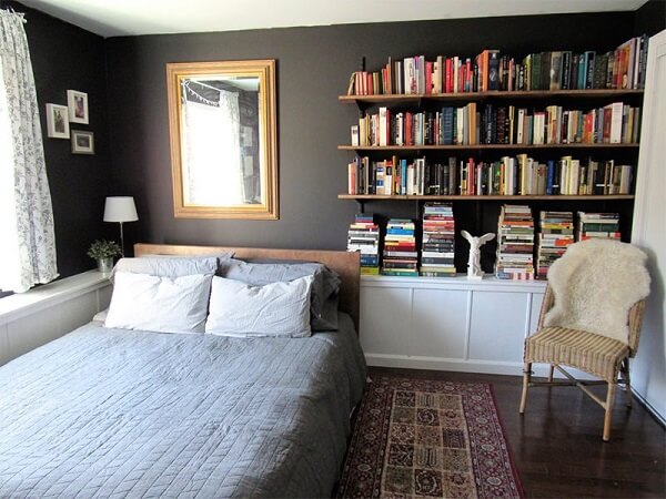 Em muitos projetos é possível encontrar modelos de estante para quarto de casal posicionadas acima da cabeceira da cama. Entretanto, dependendo do tamanho do cômodo os moradores podem ser mais ousados na etapa de decoração.