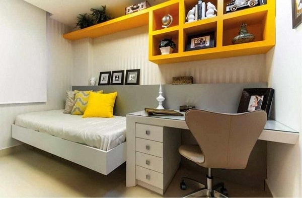 Nesse ambiente, por exemplo, a estante pequena para quarto na cor amarela, além de servir de base de apoio para inúmeros itens decorativos, ela se harmonizou e trouxe ainda mais personalidade e energia para a decoração do cômodo.