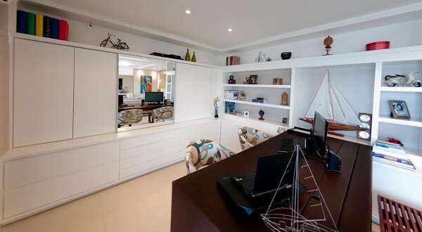 Além disso, mais do que optar pela escolha de uma estante de parede para quarto, atente-se quando a escolha das cores desse móvel. Nesse ambiente, por exemplo, os moradores optaram pela escolha de uma estante de parede para quarto na cor branca o que favoreceu ainda mais a sensação de grandeza do espaço.