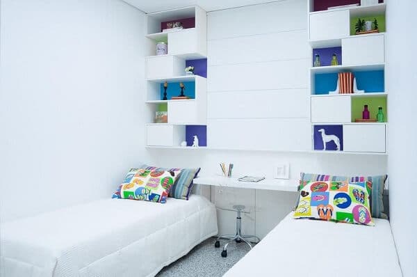 Nesse ambiente, por exemplo, os moradores optaram pela escolha de uma estante branca para quarto com o fundo dos nichos coloridos. Aqui, é possível observar que a estante para quarto, além de servir de apoio para os itens decorativos do local, ela apresenta abertura com portas onde é possível guardar objetos sem que permanecem no campo de visão dos usuários.