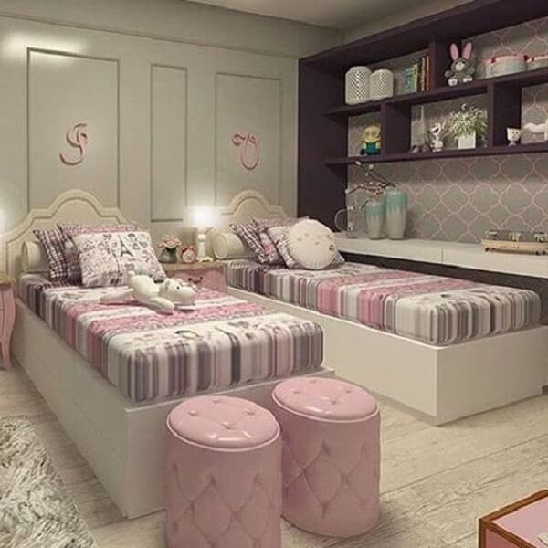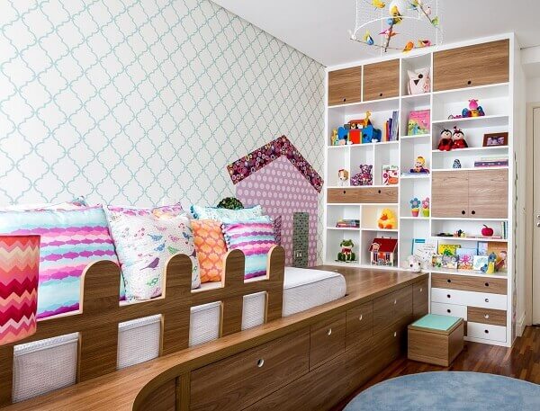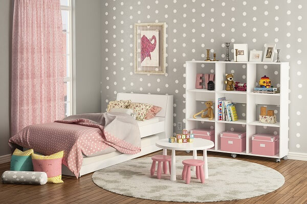 Investir em móveis funcionais e práticos facilita a organização de qualquer ambiente. E, em se tratando de quarto de menina, com inúmeras bonecas, ursinhos de pelúcia, jogos, livros de histórias e materiais escolares, incorporar uma estante para quarto infantil com diversos nichos como, no exemplo abaixo, se torna uma excelente opção.
