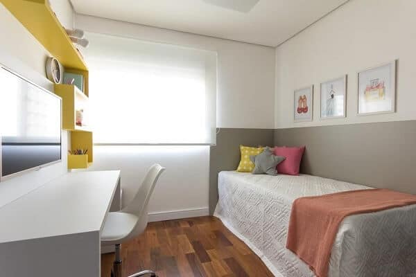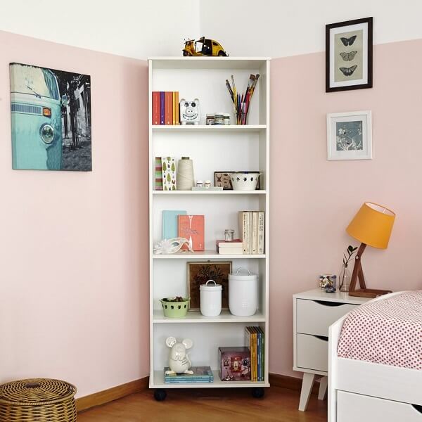 Para ambientes com estilo mais clean, procure investir em uma estante branca para quarto. Principalmente, se o seu cômodo apresentar uma área com medidas mais limitadas. Isso porque, como já mencionado a cor branca favorece a sensação de amplitude do ambiente.