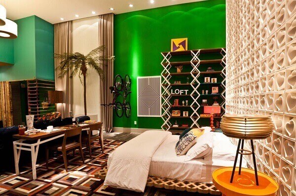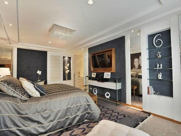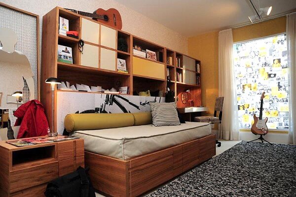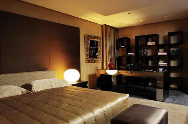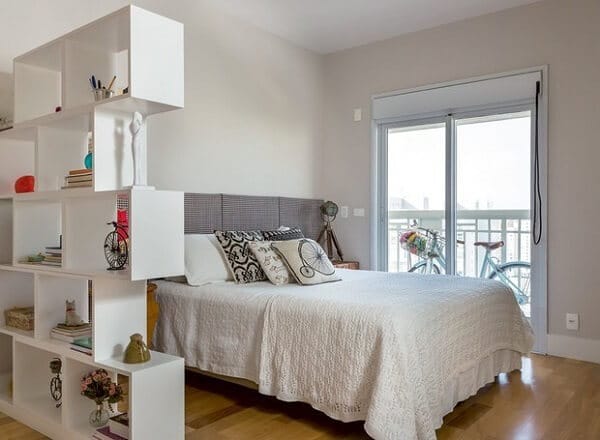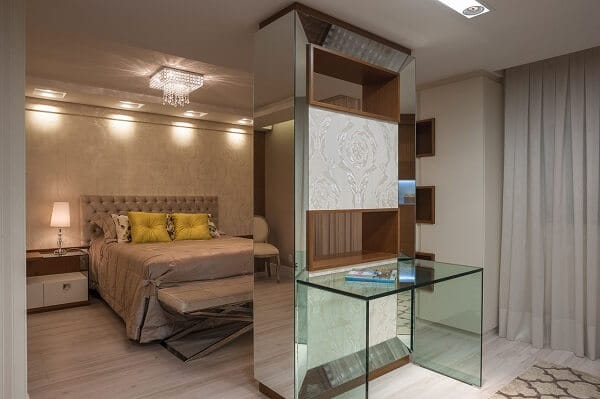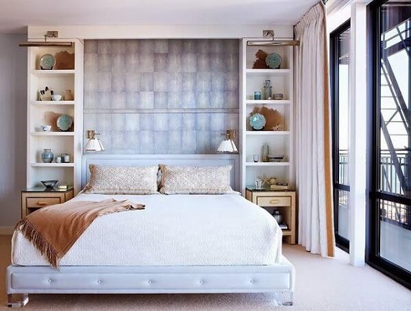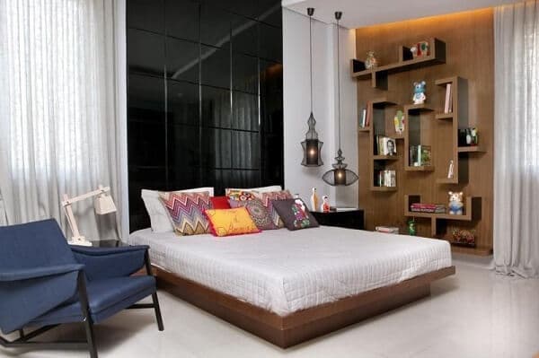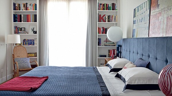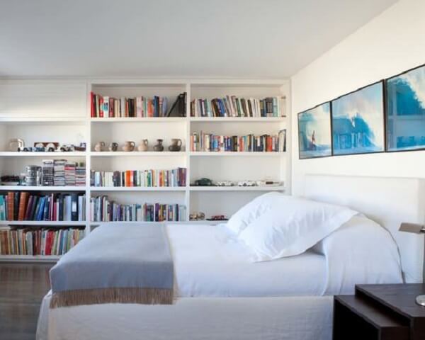 Em muitos projetos é possível encontrar modelos de estante para quarto de casal posicionadas acima da cabeceira da cama. Entretanto, dependendo do tamanho do cômodo os moradores podem ser mais ousados na etapa de decoração.