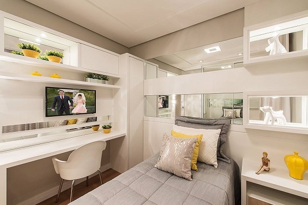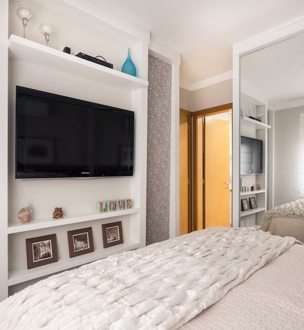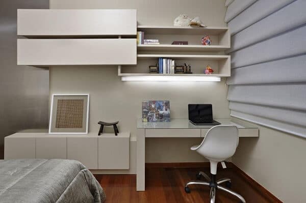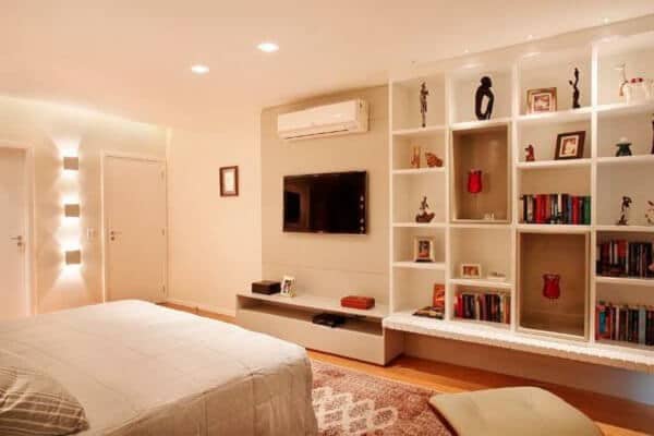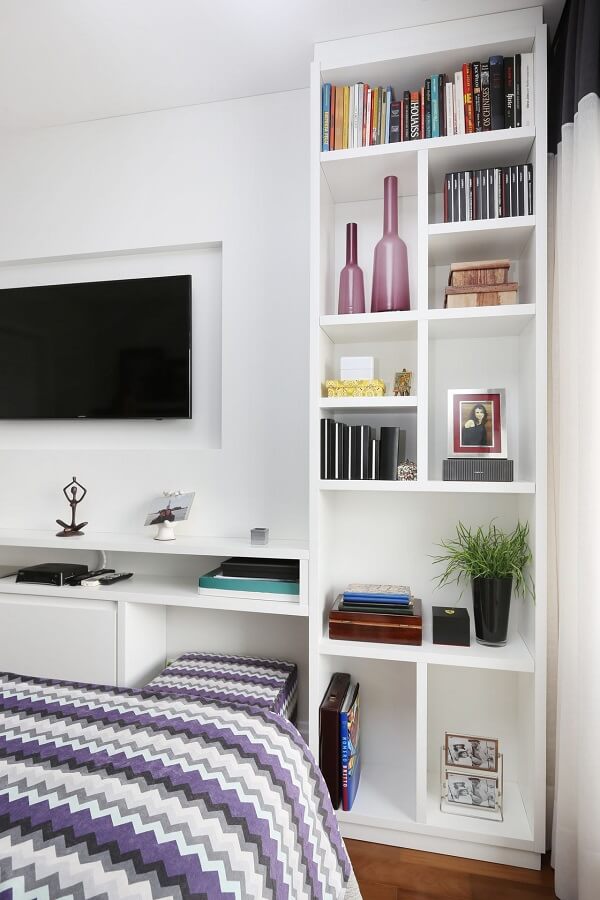 Além disso, mais do que optar pela escolha de uma estante de parede para quarto, atente-se quando a escolha das cores desse móvel. Nesse ambiente, por exemplo, os moradores optaram pela escolha de uma estante de parede para quarto na cor branca o que favoreceu ainda mais a sensação de grandeza do espaço.