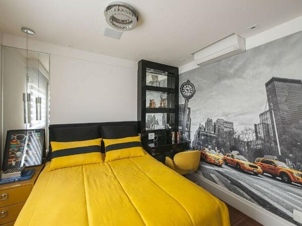 Nesse ambiente, por exemplo, a estante pequena para quarto na cor amarela, além de servir de base de apoio para inúmeros itens decorativos, ela se harmonizou e trouxe ainda mais personalidade e energia para a decoração do cômodo.