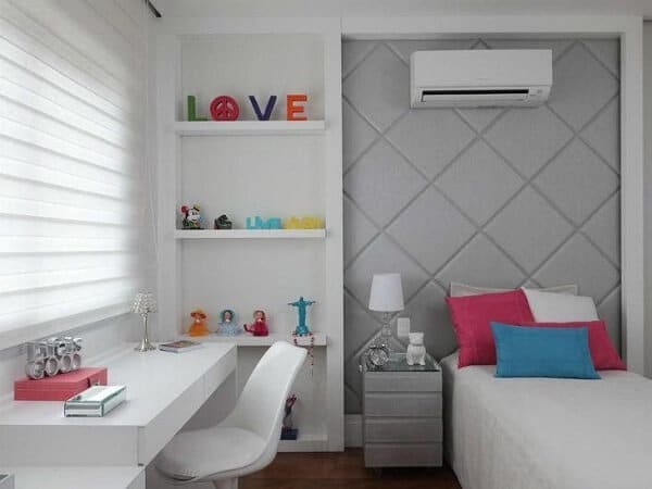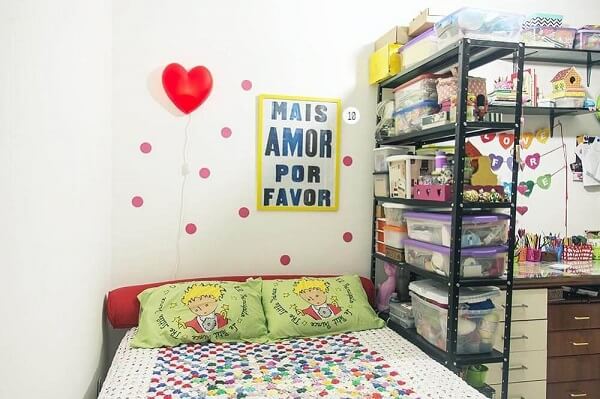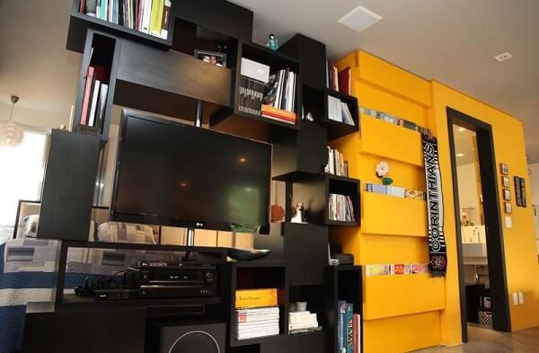 Nesse ambiente, por exemplo, os moradores optaram pela escolha de uma estante branca para quarto com o fundo dos nichos coloridos. Aqui, é possível observar que a estante para quarto, além de servir de apoio para os itens decorativos do local, ela apresenta abertura com portas onde é possível guardar objetos sem que permanecem no campo de visão dos usuários.