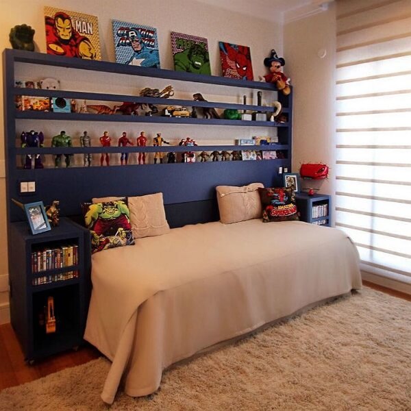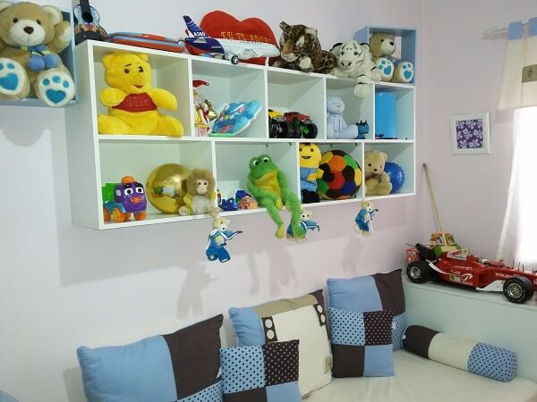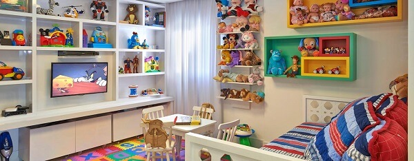 Saiba que o processo de organização de um ambiente auxilia no crescimento de responsabilidade e independência da criança. Logo, nesse ambiente, a fim de contribuir com a organização do espaço foi posicionada uma estante para quarto infantil embutida na parede, onde inúmeros bonecos colecionáveis foram expostos de forma decorativa.