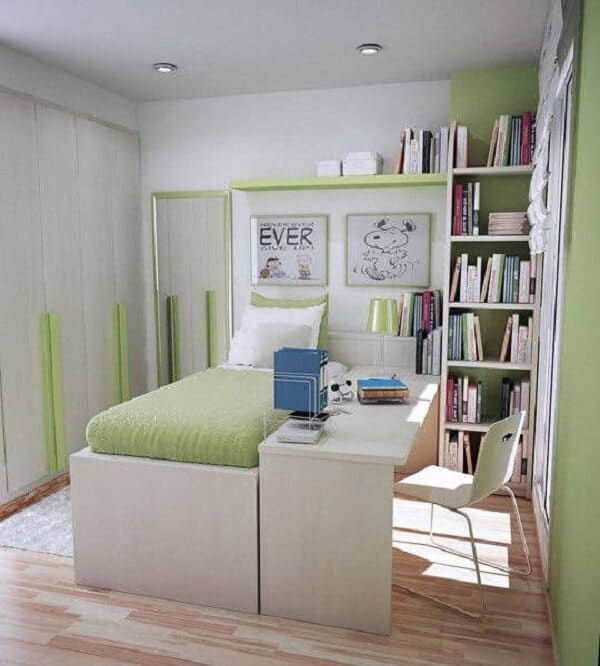 Como esse móvel pode ser encontrado nos mais diversos formatos e tamanhos no mercado, optar por uma estante pequena para quarto com espaços reduzidos pode contribuir e muito na decoração e organização do espaço.