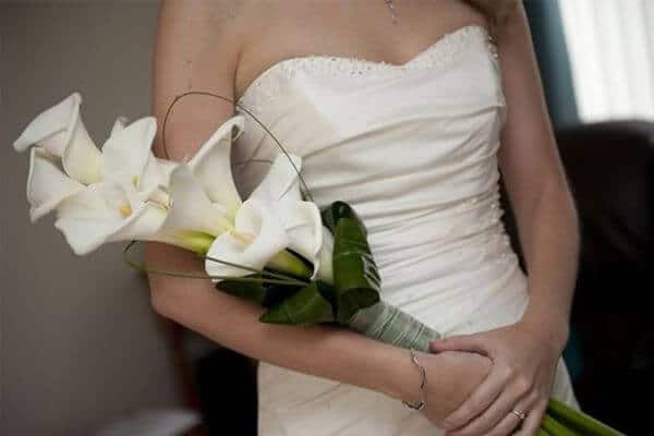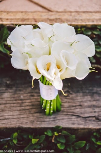 No buquê de copo de leite acima, a noiva escolheu o formato braçada para segurar a planta copo de leite. Repare que as orquídeas deixaram o buquê de copo de leite muito mais sofisticado e clássico.