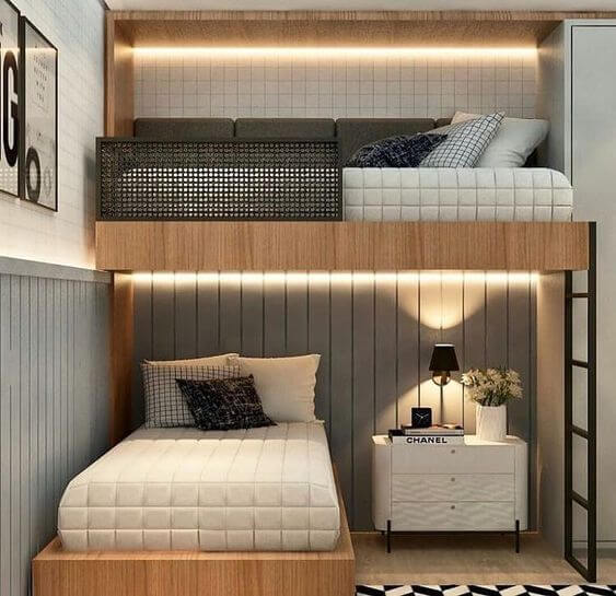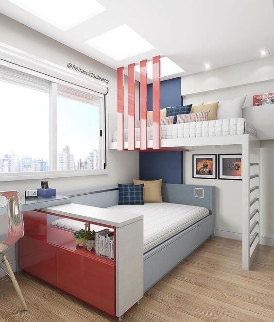 O guarda roupa não pode faltar no projeto do quarto com beliche planejado, assim como cômodas e gaveteiros para guardar seus pertences. Como o espaço será pequeno, o ideal é fazer uma beliche planejada com guarda roupa para que cada parte do seu quarto tenha um armário.