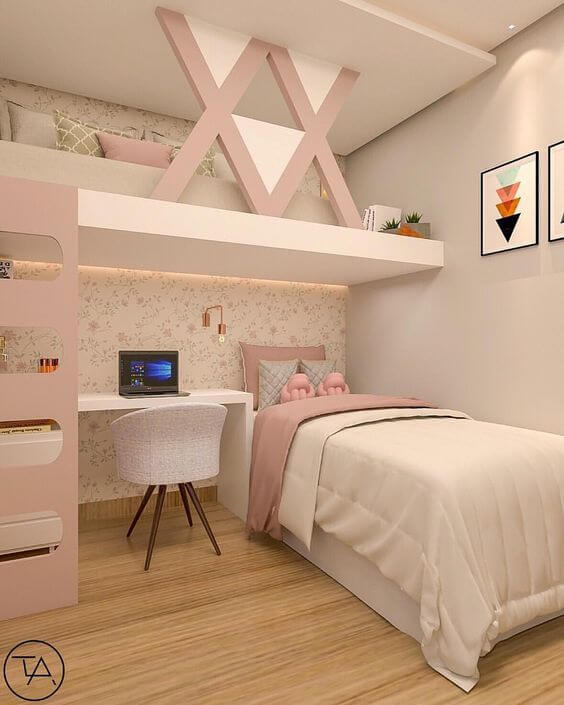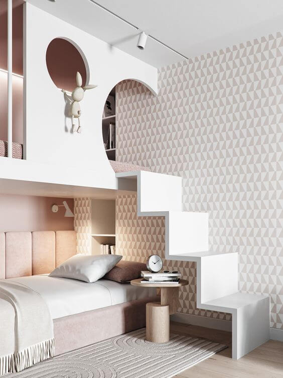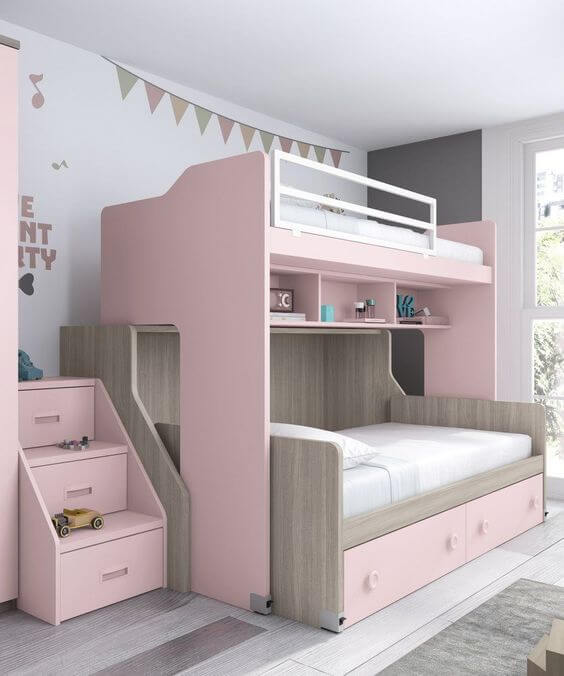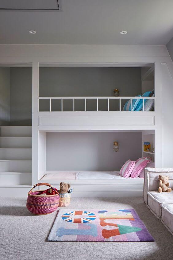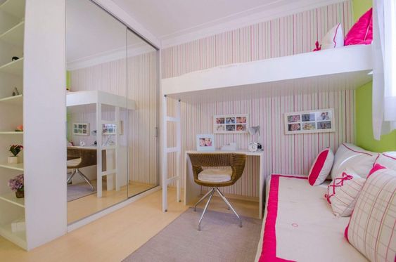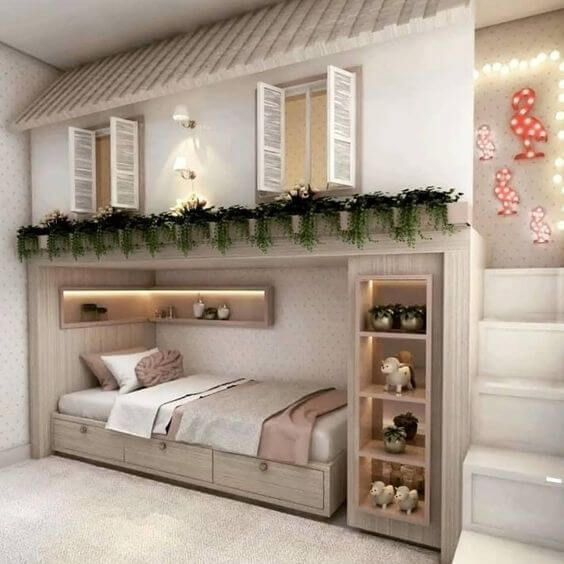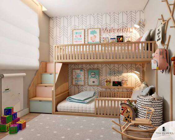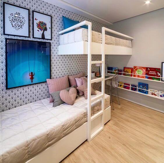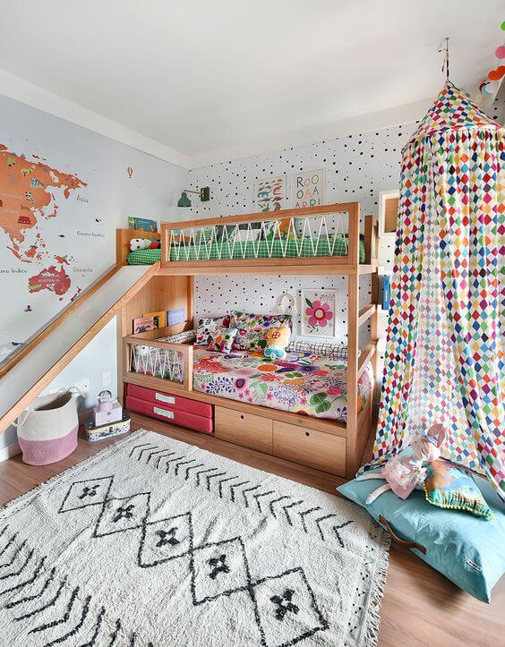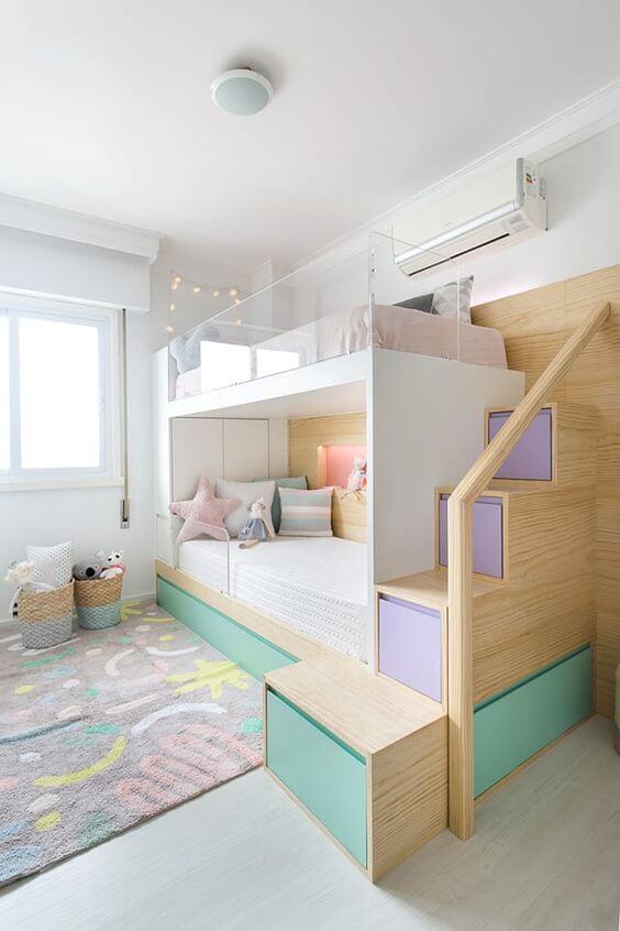 Mas se você estiver montando um quarto infantil, faça uma beliche planejada com escada e um escorregador, assim elas ganham um espaço a mais para brincar e se divertir no quarto. Depois, quando elas não gostarem mais do escorregador, é só tirar e ficar apenas com a escada.