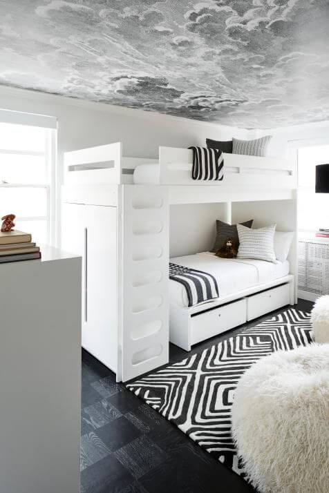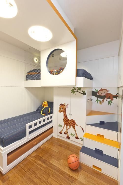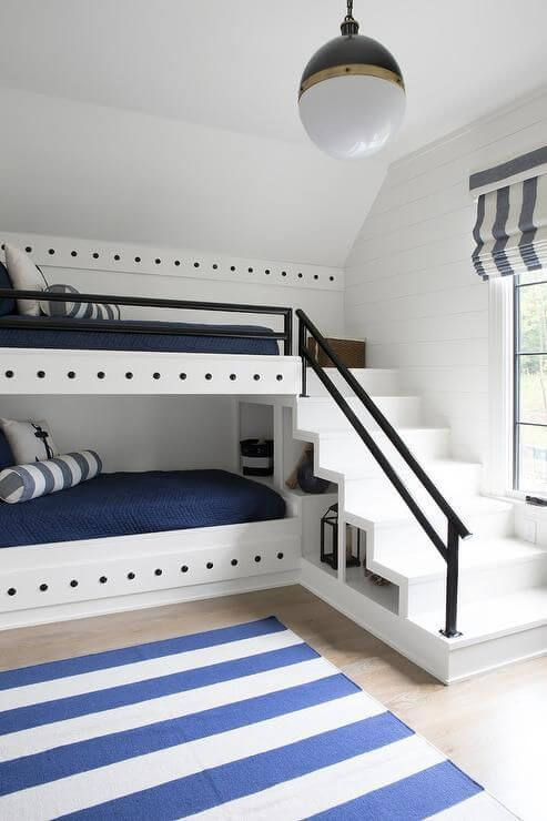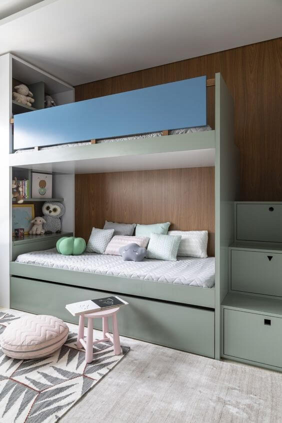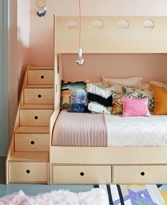 O modelo tradicional de beliche planejada é feito com uma escada simples ao lado das camas. Porém, você pode aproveitar para fazer uma beliche planejada com escada maior e funcional: com gavetas e estantes em cada degrau.