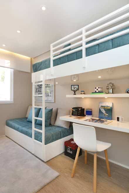 Outra maneira de ter uma beliche com escrivaninha planejado é instalar uma mesa dobrável em algum cantinho do quarto. Fica prático para abrir e fechar e a beliche planejada com escrivaninha não atrapalha na circulação do ambiente.