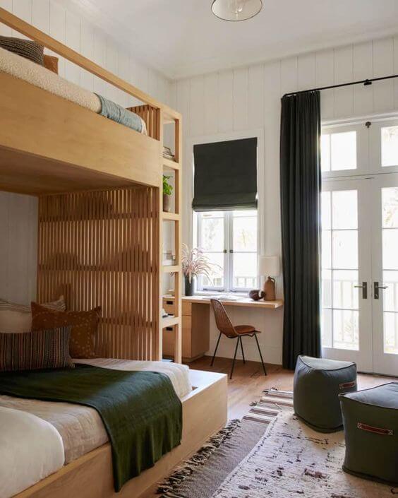 Outro móvel que indicamos colocar no quarto com beliche planejado é a escrivaninha. Não precisa ser um modelo de beliche com escrivaninha planejado grande, apenas uma bancada simples já será o bastante para que seus filhos possam estudar ou trabalhar.