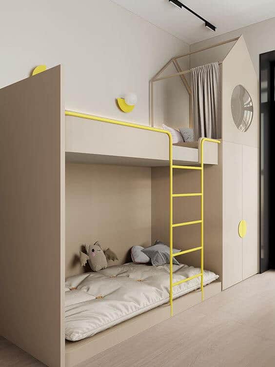 Como a beliche planejada para quarto pequeno é feita sob medida, vale a pena incluir outros móveis na estrutura da beliche, como uma escrivaninha, guarda roupa ou nichos embutidos na escadinha da beliche planejada. Dá para usar a criatividade para otimizar cada cantinho do local.