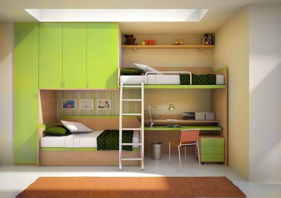 Existem várias maneiras de fazer uma beliche planejada com escrivaninha. A mais comum (também vendida em móveis modulados), é feita com uma cama encostada em cada parede do quarto e, no espaço que fica vazio, é feito uma escrivaninha prática, com direito a estante e prateleiras para colocar livros e objetos decorativos.