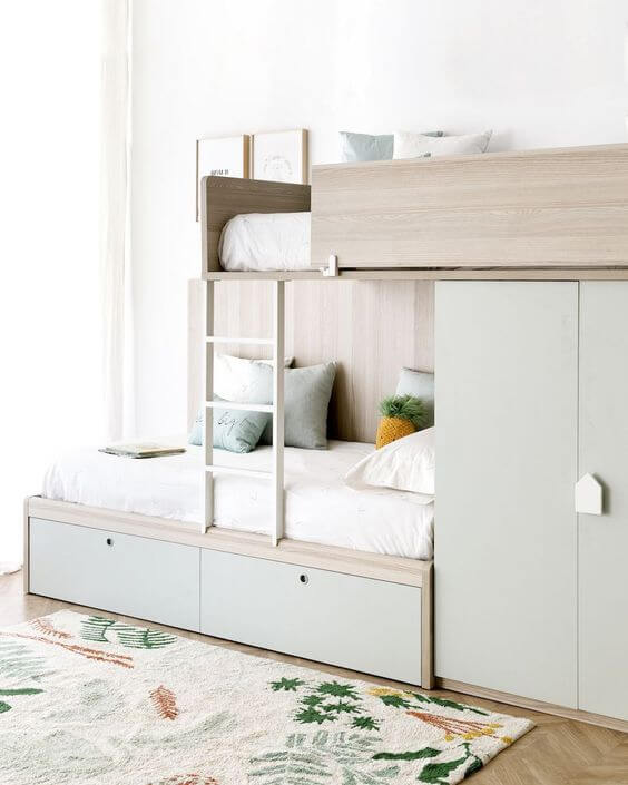 Fica prático e bem decorado, como na beliche planejada com guarda roupa da foto abaixo: