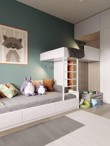 Evite fazer a beliche infantil planejada com camas pequenas. Como os móveis planejados são feitos para durar anos, vale muito mais a pena já fazer no tamanho de cama box de solteiro, desta forma, conforme as crianças crescem, você só precisa trocar a decoração do quarto.