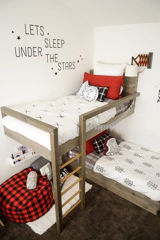 Outra dica para ter o quarto planejado com beliche e guarda roupa é mandar fazer uma cama de cada lado do projeto e adicionar armários e gavetas no espaço entre elas. Desta forma, além da beliche planejada com guarda roupa, você consegue colocar outros móveis no quarto à vontade, como fazer um cantinho da leitura com puffs, estante e luminária.